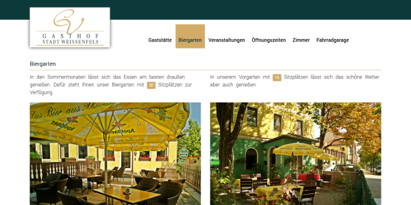 Zur Zeit arbeiten wir an der Umsetzung diverser Webseiten. Eine davon ist im Bild rechts zu sehen. Es handelt sich dabei um die Gaststätte Gasthof Stadt Weißenfels. Ein beliebter gutbürgerlicher Gasthof mit Pension, den Sie auch mit dem Rad anfahren können. Das Motto des Hauses lautet stets Lassen Sie sich verwöhnen. Und das können Sie hier hervorragend. Mit einem schönen Biergarten lässt es sich im Sommer sehr gemütlich sitzen. Wir sind in den letzten Zügen, kleine Anpassungen am Design sowie in den letzten Planungen für das weitere Verfahren.